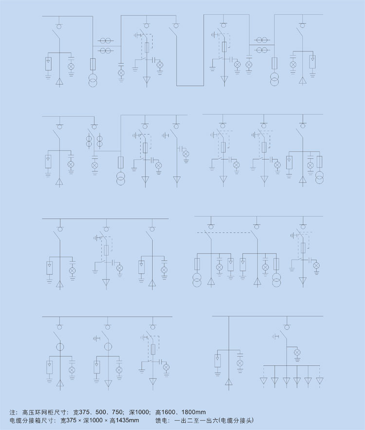 环网柜为金属铠装封闭式,柜内为空气绝缘,具有终端变电站接线及适应环网供电的接线。